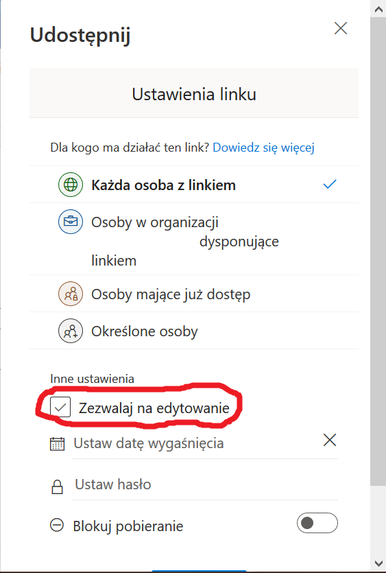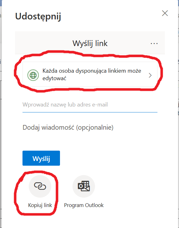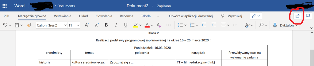 W jaki sposób przekazać kompletną tabelę uczniom? Wracamy do ikony udostępniania. Pojawia się znane nam już okienko