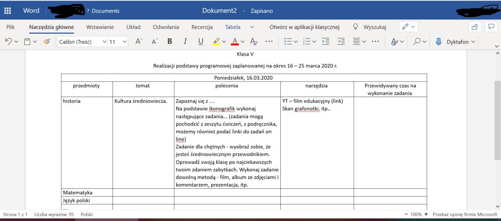 Przechodzimy do tworzenia harmonogramu. Za tę część powinna być odpowiedzialna grupa koordynatorów, powołana przez dyrekcję. Ich zadaniem będzie przygotowanie dla każdego oddziału tabeli z wypisanymi z planu lekcjami i udostępnienie linku wszystkim nauczycielom.