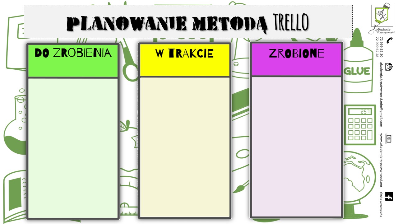 Przykład przed Wami. Przedstawiamy Wam metodę planowania opartą o schemat KANBAN. My nazwaliśmy ją TRELLO (to internetowa aplikacja do tworzenia list w stylu Kanban)